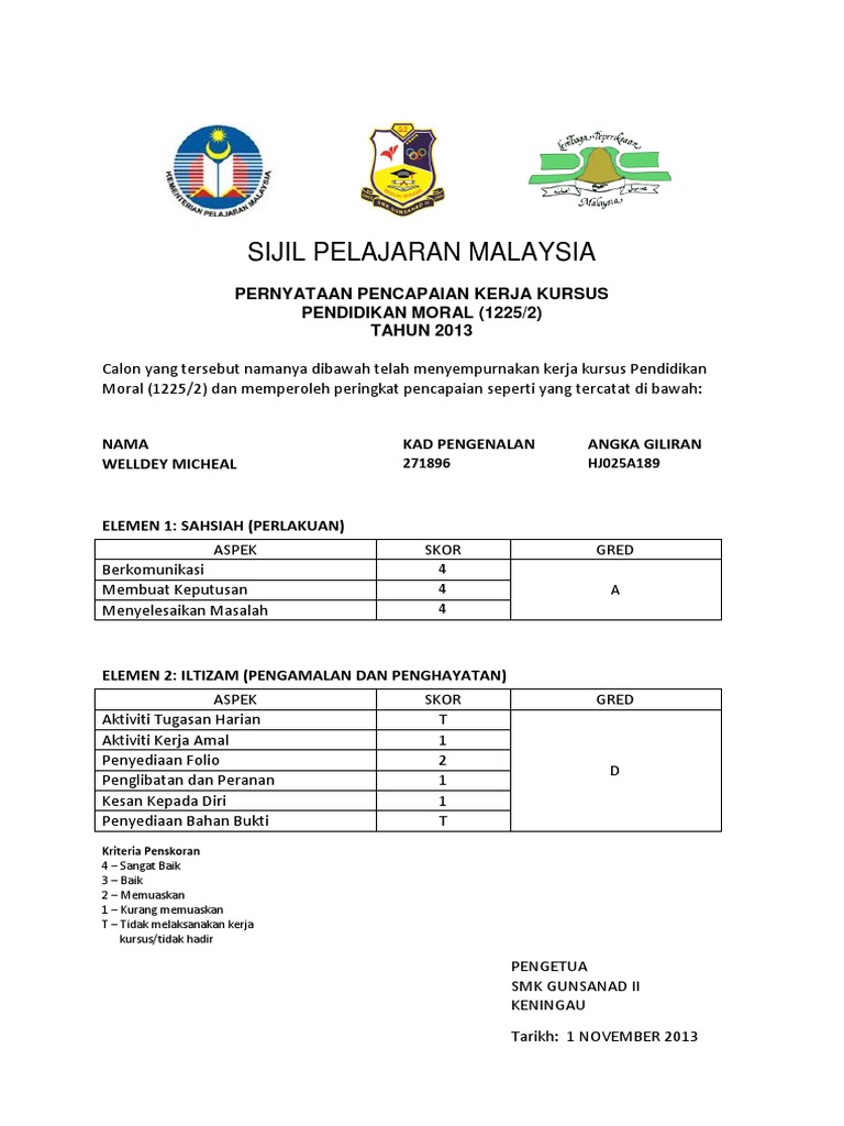 Sijil Kerja Kursus Moral Print Pdf